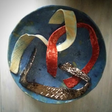 Sommige wegen in je leven zijn zó cruciaal dat ze levensbepalend zijn. In deze schaal 3 levenspaden van mij die echt richting hebben gegeven aan mijn leven. De rode draad in mijn leven is Jezus. De koperen draad is mijn gezondheid. Ergens zit een breuk in het pad, dat was een ernstig ongeluk op mijn 17e. Er is een leven vóór en een leven ná. De lichtgroene draad zijn de mensen in mijn leven. Groen staat voor groei en ontwikkeling. Door zoveel mensen ben ik gegroeid en ontwikkeld. Maar ook in deze draad zit een barst. Mensen kunnen het mooiste in je leven zijn, maar helaas heb je in relaties te maken met barsten.
